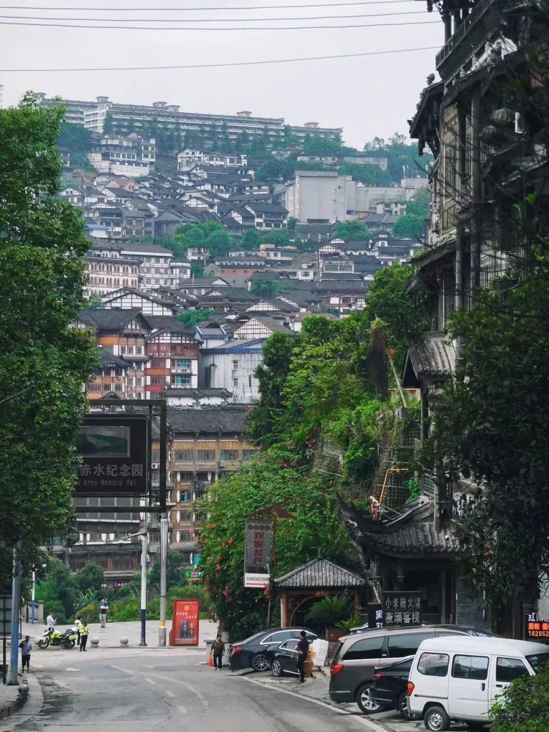 茅台镇前些年整体重新规划过,想要以酒业来带动旅游业,全部楼房都改造成西南传统民居式样,从高处看起来,从河岸边一层层地逐次往上,画面也相当地和谐优美。