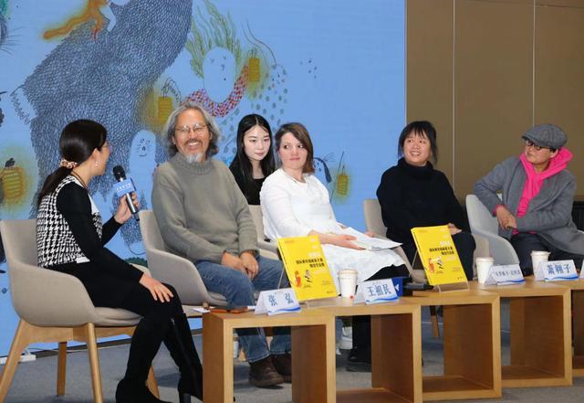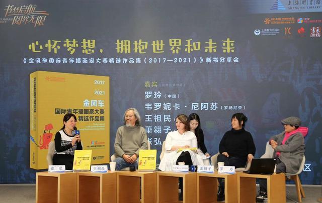 “心怀梦想,拥抱世界和未来”《金风车国际青年插画家大赛精选作品集2017-2021》新书分享会现场,儿童文学作家、“魔法童书会”创办人张弘,与金风车青年插画家大赛金奖得主罗玲和韦罗妮卡·尼阿苏(罗马尼亚),图画书画家王祖民和萧翱子等共聚,分享金风车国际青年插画家大赛得奖佳作和成长经历。