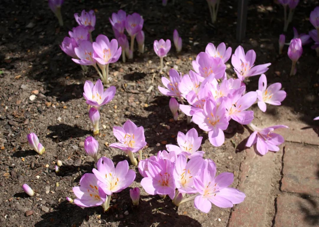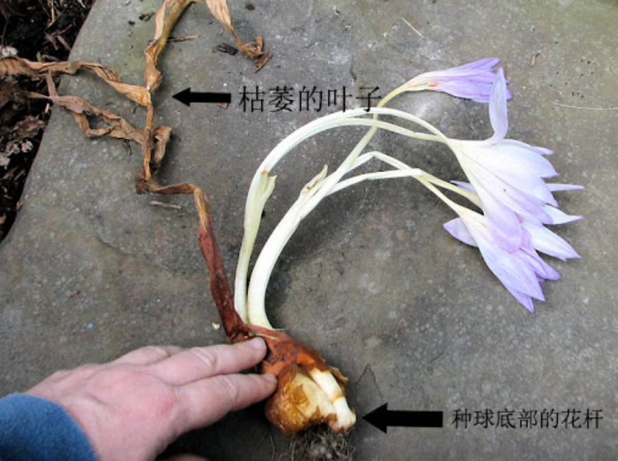 秋水仙和石蒜花(彼岸花)有点相似的,都是用种球栽培,而且都是先开完花再长叶子,开花的时候是看不到一片叶子的,就是光秃秃的一个花杆和花朵,好在它的花杆并不是太长,并不会降低它的观赏性。
