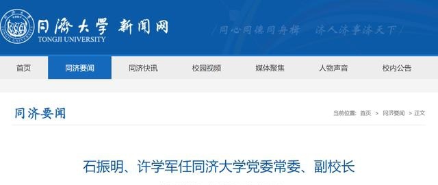 记者今天(11月20日)从同济大学获悉,石振明任同济大学副校长(试用期一年)、党委常委,许学军任同济大学副校长(试用期一年)、党委委员、常委。