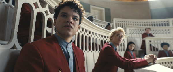 不同于“屠龙少年终成恶龙”的常见叙事,《鸣鸟与蛇之歌》为人物设计的弧光,从肇始便让观众隐隐不安。电影并没有试图让男主角成为“傻白甜”,反而处处以真正的“傻白甜”男配角塞詹纳斯(乔什·安德烈斯·里维拉饰演)与男主角形成镜像。斯诺与塞詹纳斯在家境和性格上的对比,更是从影片开始便埋下伏笔,以暗示两人最终的分道扬镳。电影从校园走向军营,场景的转换,对应着生存压力的陡增,也对应着两人的渐行渐远,直至最终殊途。