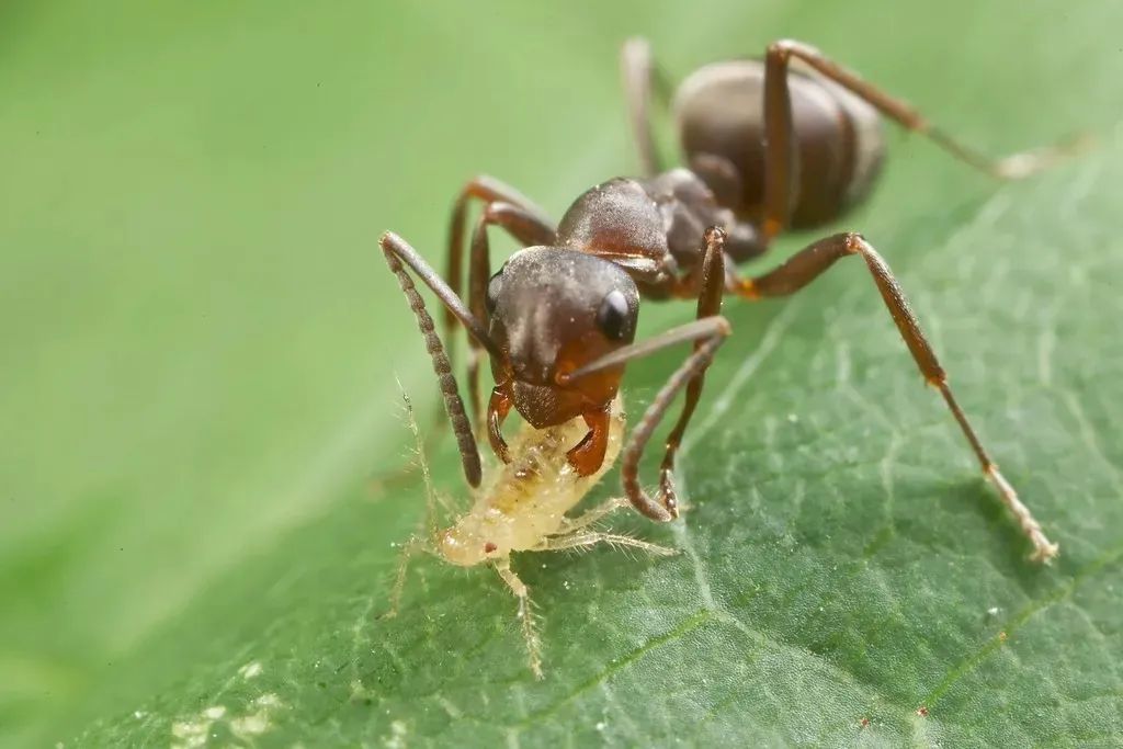 蚂蚁和蚜虫是一种互生关系,蚂蚁会将蚜虫搬到一些健康的植物上,让蚜虫不断繁殖,而蚜虫则会给蚂蚁提供分泌物,蚜虫吸取植物的汁液之后,会排泄一些蜜露。