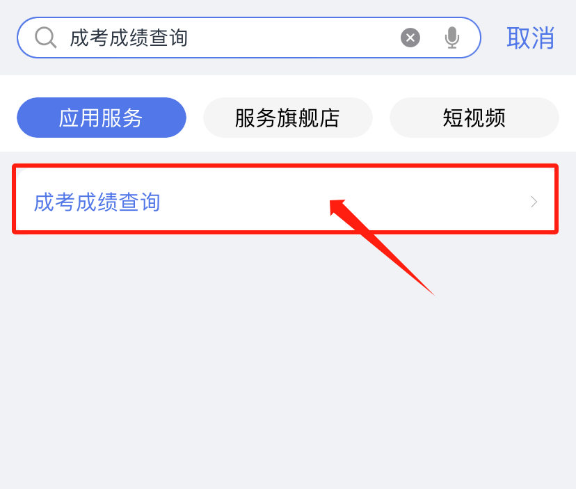 1、进入“爱山东”APP、支付宝、微信小程序,首页搜索“成考成绩查询”,点击进入。