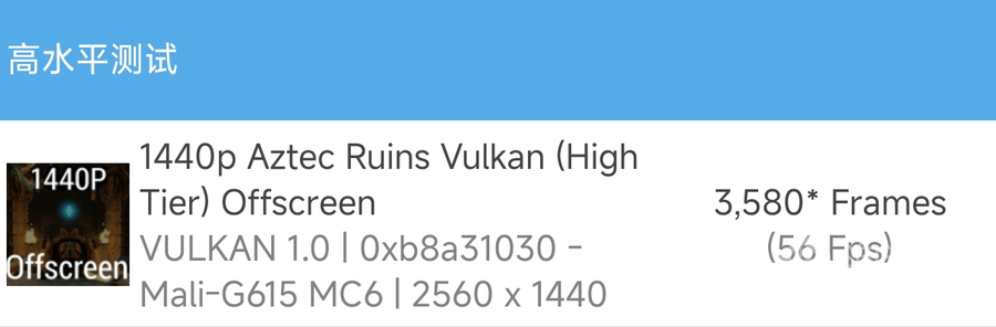 GFXBench测试Aztec Ruins 1140P Vulkan,帧率达到了56fps,1080P曼哈顿离屏帧率为284fps。