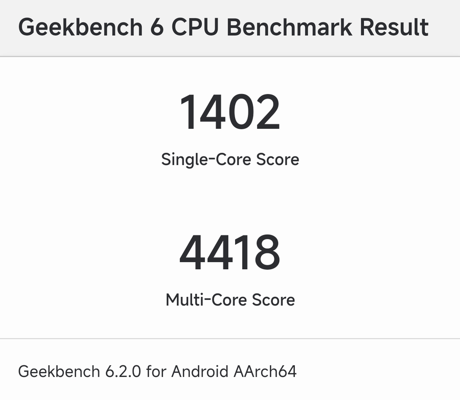 CPU方面,通过GeekBench 6.2测试,Redmi K70E的单核成绩为1402,多核成绩为4418。