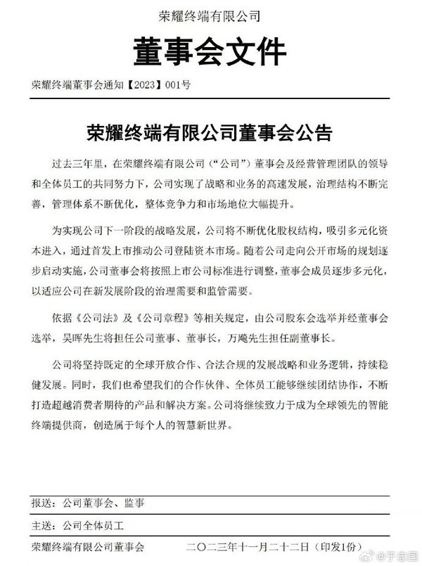 以下为荣耀终端有限公司董事会公告原文: