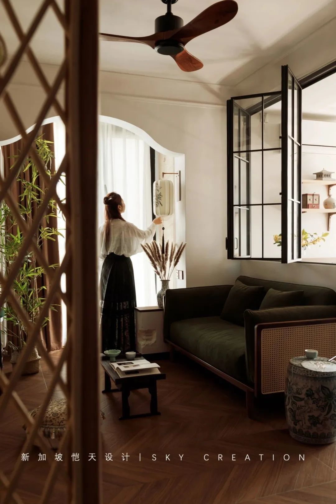 一侧墙面储物、另一侧则造景,弧形门洞、老榆木收纳柜、中式瓷器、热带绿植墙布……形成一种独特的怀旧南洋风,宛如老旧电影里的质感。