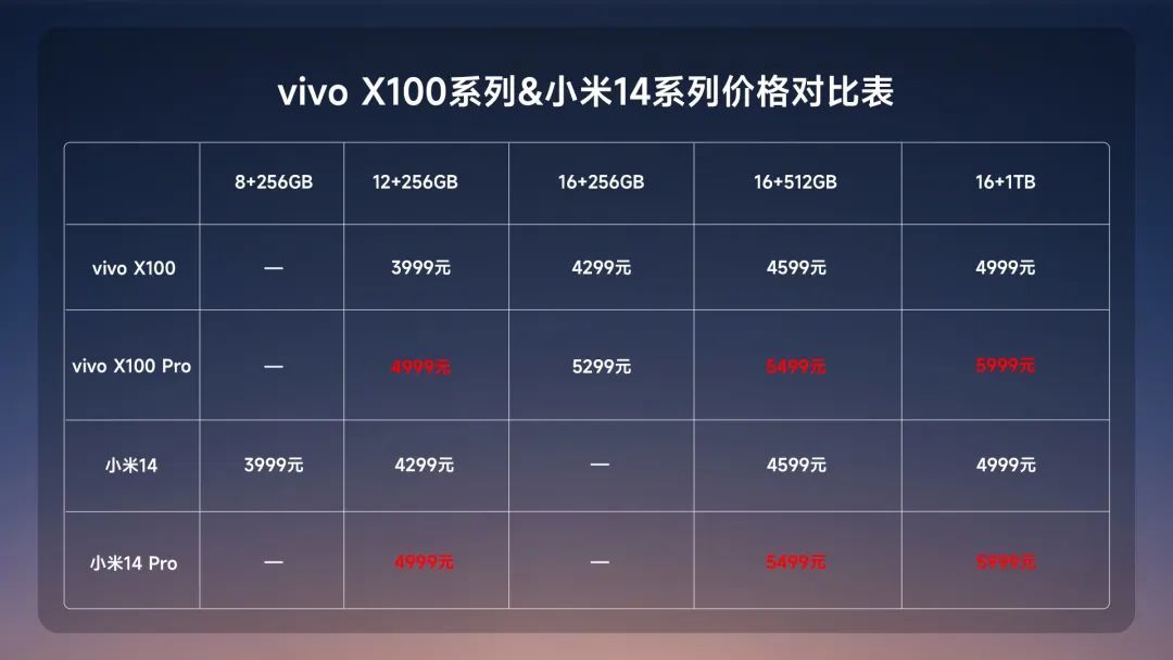 说来也巧,他们发布时间仅相差半个月,售价都是4000元档位,并且vivo X100系列号称「年度满分旗舰」小米14系列也说自己是「全能旗舰」,有点意思。秉承专业精神,我也仔细对比了一下vivo X100和小米14全系产品,除了标准版在8+256GB版本上有差异,其他的版本定价基本上一样。