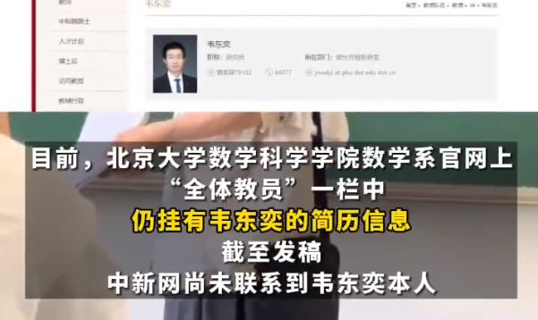 在北大数学科官网上的“全体教员”一栏中,仍挂有韦东奕的简历信息。