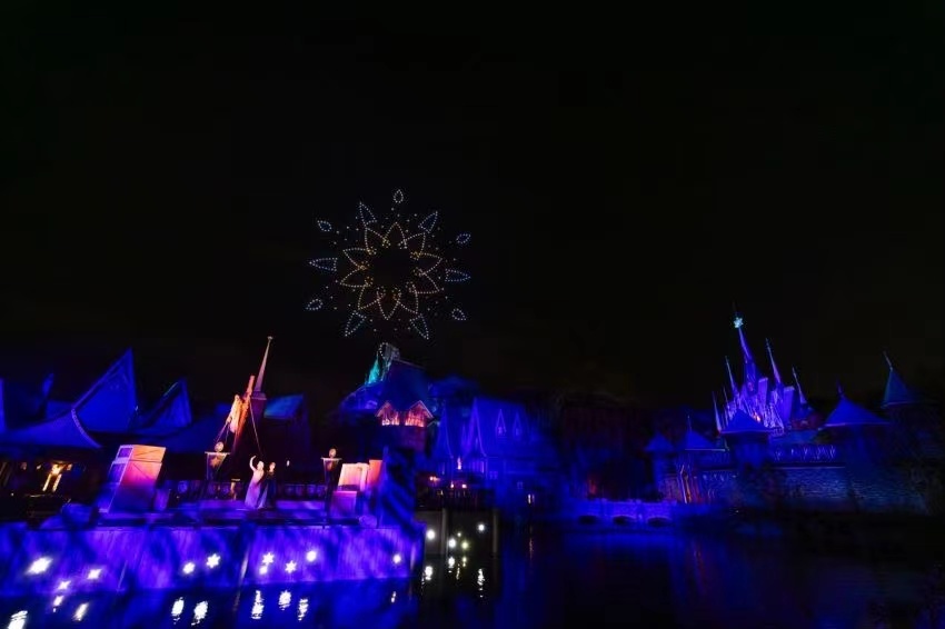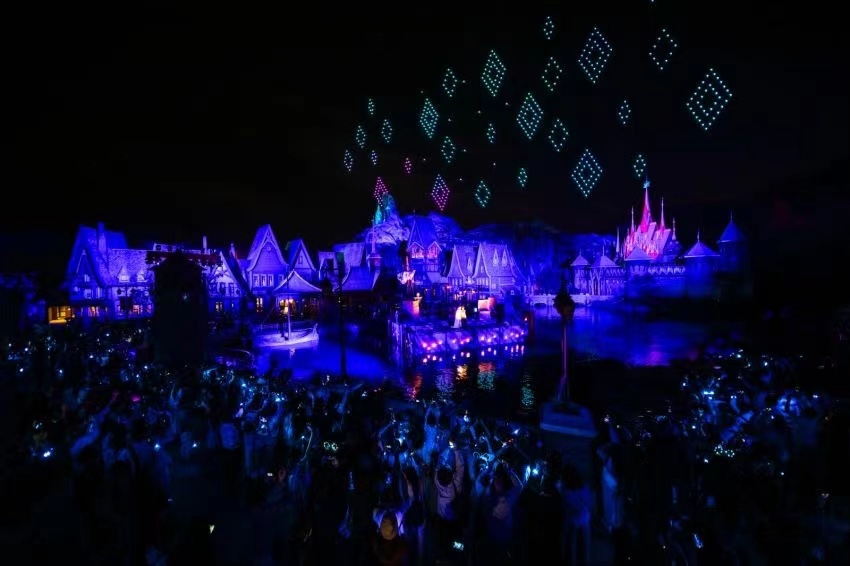 伴随着天籁的歌声,艾莎现场施展冰雪魔法,召唤雪宝现身,将阿伦黛尔变得生气勃勃。安娜女王宣布阿伦黛尔的大门即将打开,而一众宾客也在阿伦黛尔的迷人星空下享受了一场夜间派对。百余架无人机点亮“魔雪奇缘世界”园区夜空,与现场观众共赴“冰雪之约”。