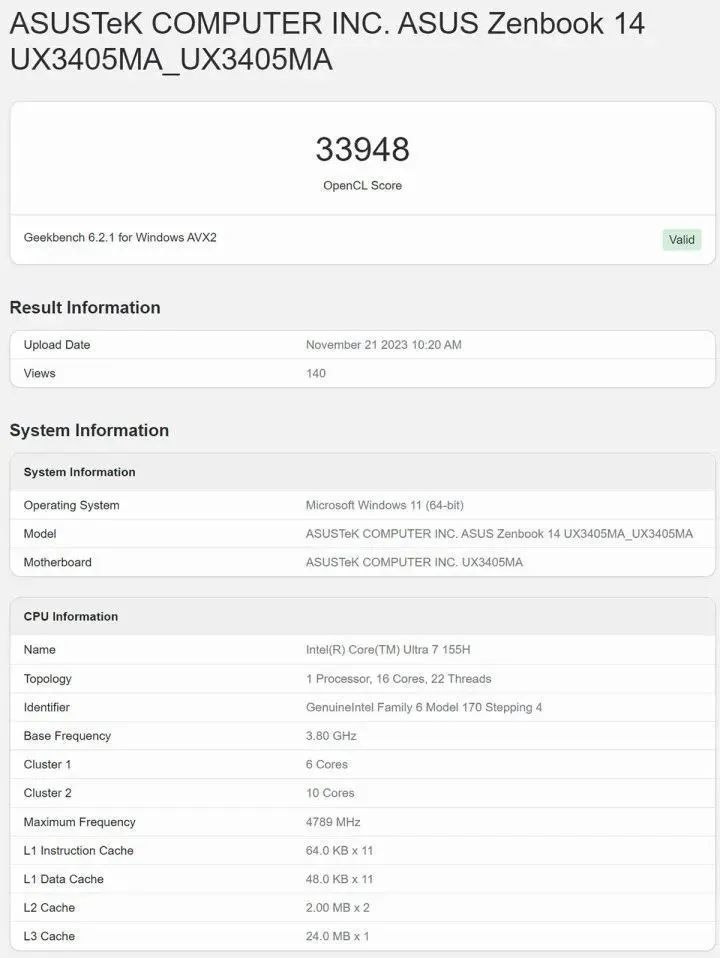 此次测试结果来自华硕Zenbook 14,这台测试机搭载了酷睿Ultra 7 155H处理器和32GB内存,这款处理器采用Intel Arc Xe-LPG架构核显,拥有8组Xe-Core共128个Xe矢量引擎,核显频率2250MHz,处理器拥有6个P-Core,8个E-Core和2个LP E-Core,16核22线程,最大睿频4.8GHz。