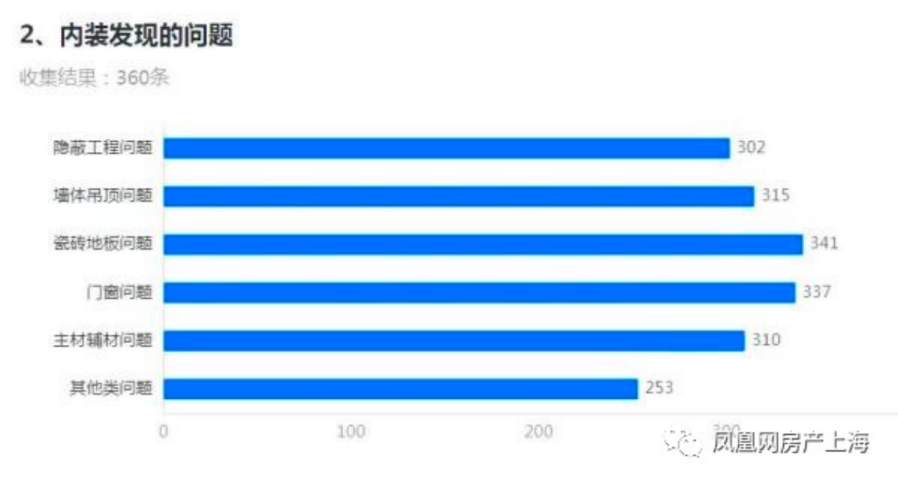 今年上半年,中企云萃江湾交房前,有业主牵头发布了一份调查问卷,从558户业主中收集到了360份结果。其中,超过300份结果称,同时发现了隐蔽工程问题、墙体吊顶问题、瓷砖地板问题、门窗问题和主材辅材问题。