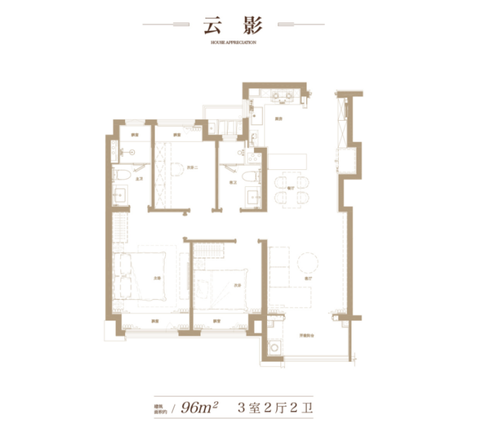 项目共388套房源,分为毛坯和精装两种产品,主力户型为96㎡3房2厅2卫,共348套,另有40套建面约127㎡4房2厅2卫房源。