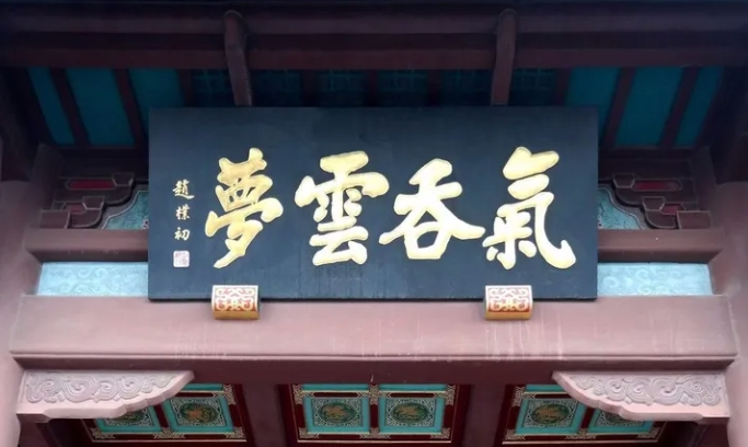 黄鹤楼一楼外面的正上方,悬挂着一块巨大的牌匾,上有国家政协原副主席赵朴初所书“气吞云梦”四个金灿灿的大字,吞云吐雾,苍劲有力。在牌匾两边的桃木上,刻着一幅由中国近现代著名书法家刘海粟老先生书写的对联:“登斯楼揽斯景怒江劈峡画中天地壮人间;由是路入是门奇树穿云诗外蓬瀛来眼底。”将登楼揽胜、江水奔腾、浩淼无边,一泻千里的雄阔意境刻画得淋漓尽致。