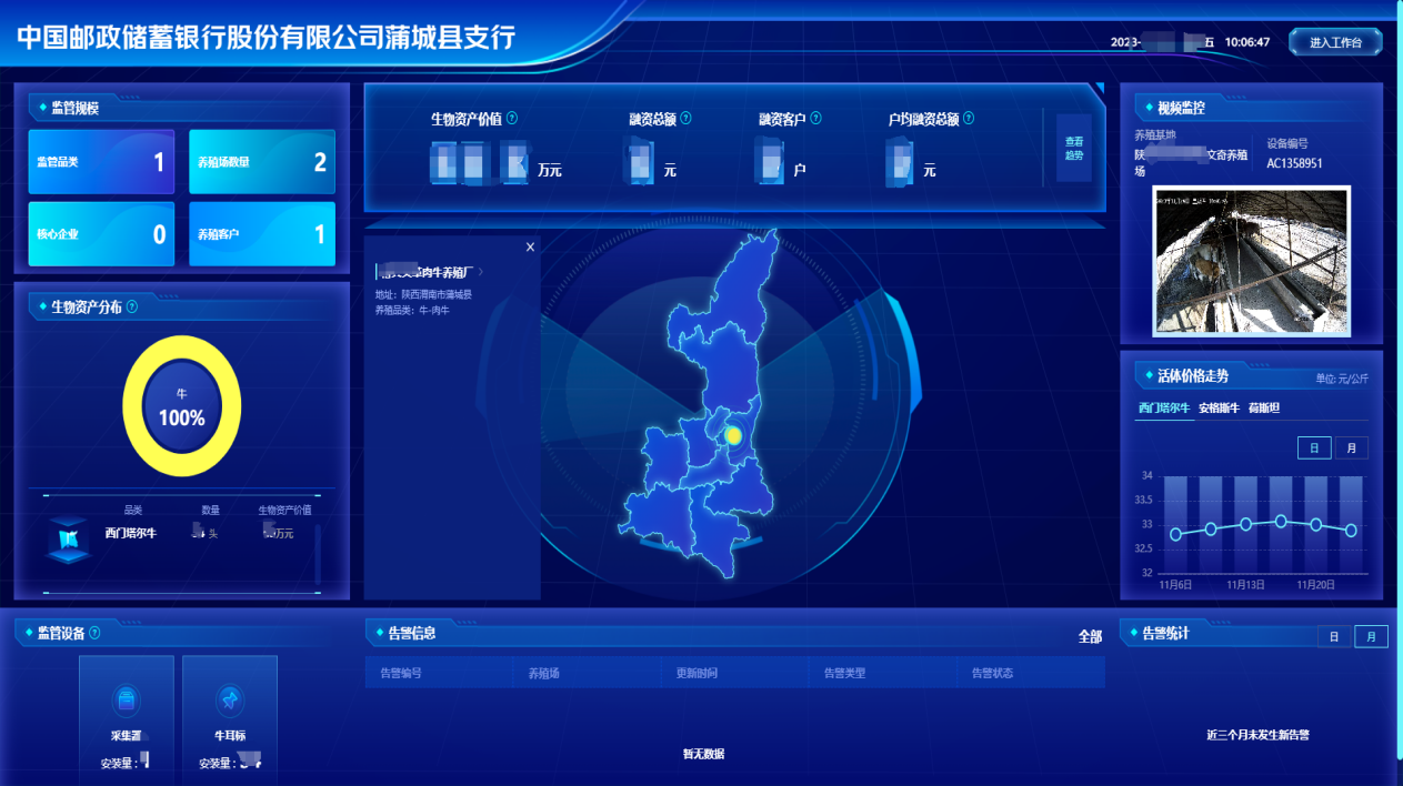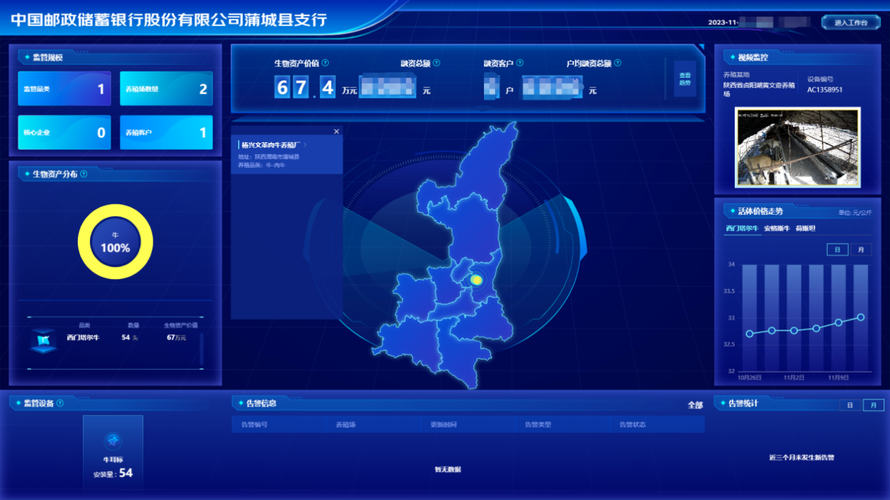 养殖户王大哥是蒲城县城关镇椿兴村的一位资深养牛人,牛场存栏肉牛近200头。随着养殖规模逐步扩大,需要的资金也越来越多,这让老王犯了难:“今年准备再扩建牛棚,扩大养殖规模,跑了几家银行,都说我这难监控、风险大,这额度提不上去,钱不够可咋办”。邮储银行蒲城县支行在得知老王的融资需求后,考虑到养殖规模较大、单体价值较高、活体监测较难等情况,积极对接京东科技展开合作,利用智能耳标搭配大数据、人工智能、区块链等技术,构建全新的适合当地“拴养”肉牛养殖的生物资产活体监管平台,对客户生物资产实现24小时远程监控,为增加客户授信额度提供有效经营监测数据。