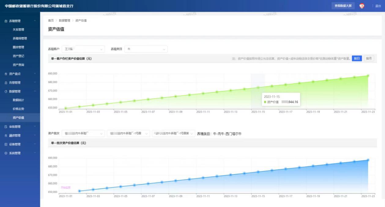 生物资产活体监管平台支持对肉牛养殖过程中的存栏数量、运动轨迹、生命体征等数据进行分析和处理,同时,拥有不同品类生物资产的价格指数,结合大数据模型模拟的肉牛生长曲线数据,可以对养殖户的活牛进行资产价值评估,准确掌握客户经营及资产情况,当养殖户的牛只触发风险告警规则时,银行客户经理会在第一时间收到平台发送的告警电话,实现贷后风险实时监测。通过对客户养殖情况的全周期有效评估及监测,在客户合理经营能力基础上,充分满足客户融资需求,为养殖户老王增额授信50%,实现“活物”变“活钱”。“这下钱可有着落了,牛棚能建起来了”,老王开心的说到。