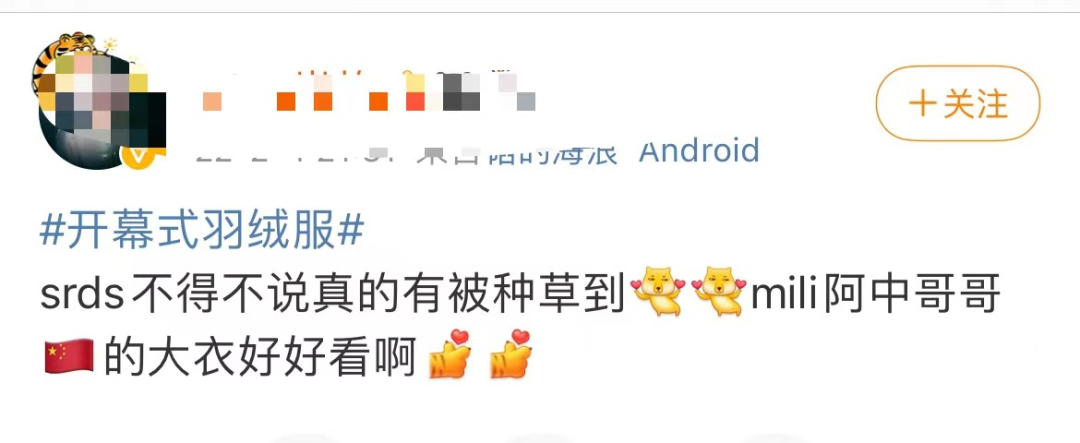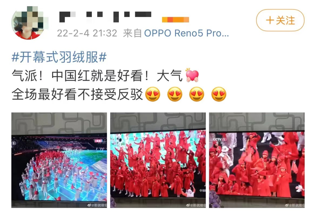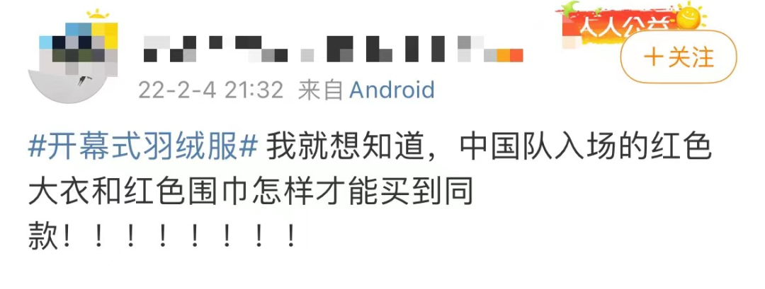 话题#开幕式羽绒服#登上微博热搜,中国队由安踏品牌赞助的红色羽绒服也出了圈,不少网友表示希望买到同款的大红羽绒服和大红围巾。