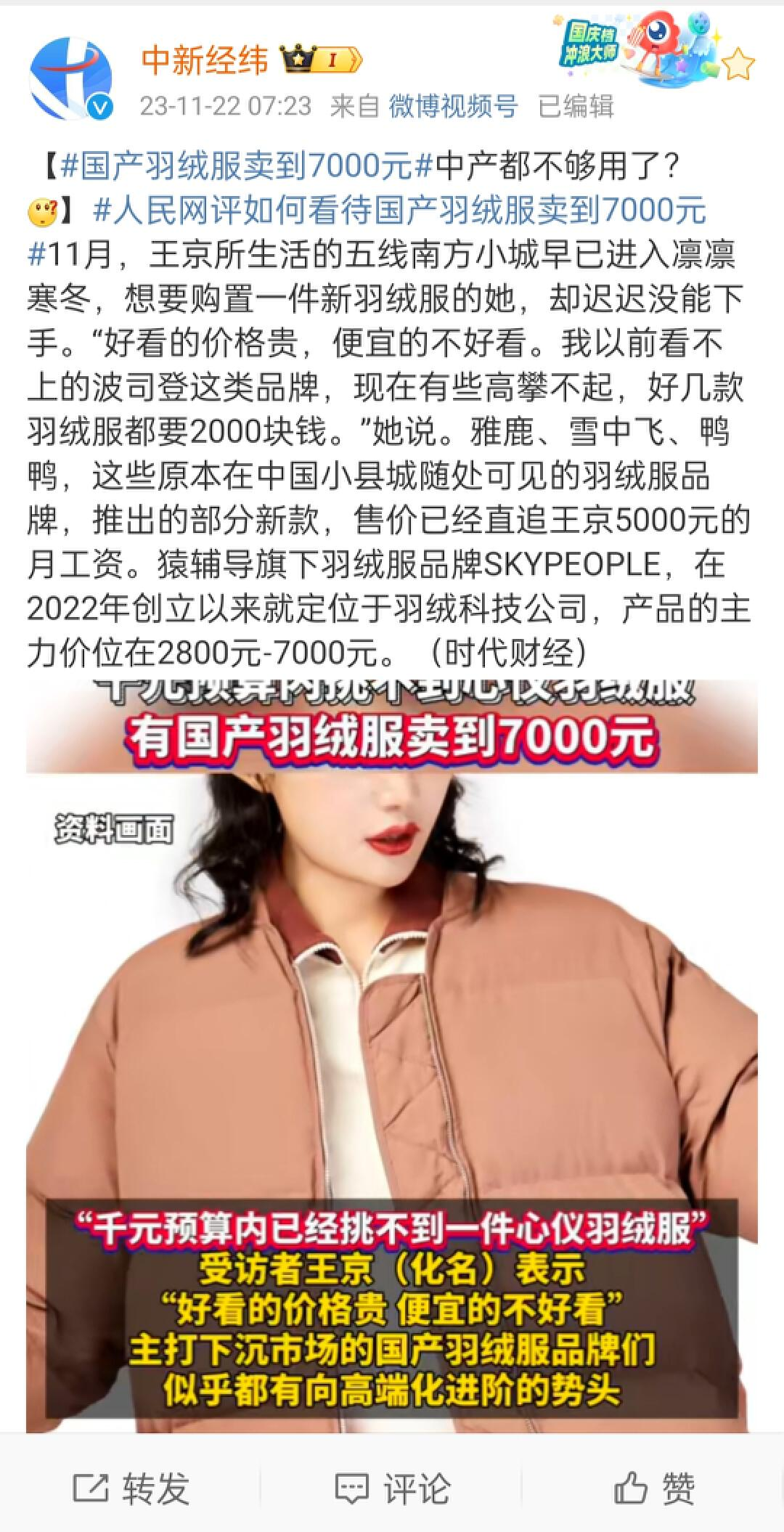 11月22日,中新经纬发布微博“#国产羽绒服卖到7000元#中产都不够用了?”相关内容引起热议。