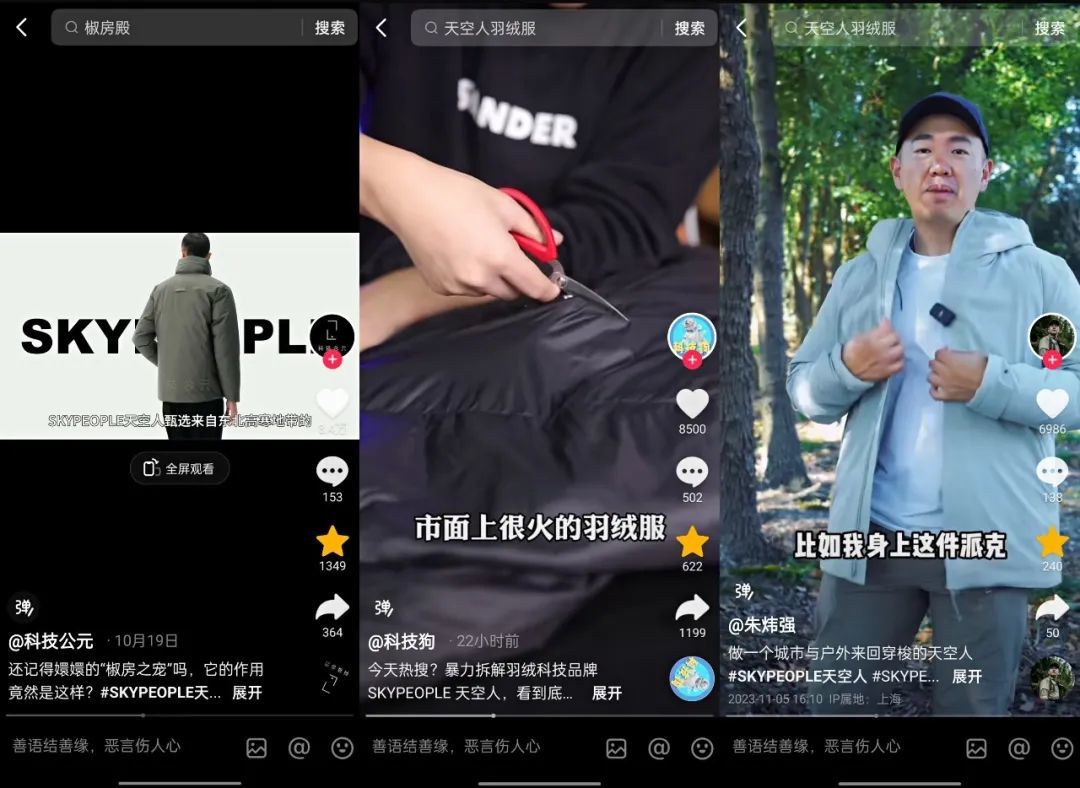 另一位科技测评类博主“科技狗”则是用拆衣测评的方式测试了天空人品牌的保暖和防寒效果,登录过discovery频道和CCTV9《绝境求生》的野外生存专家“朱炜强”也发布了相关测评视频。