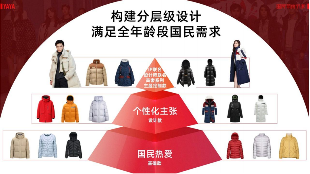 鸭鸭则根据自己的产品线建构了分层级设计的模型,位居“金字塔”顶端的“IP联名”、“设计师联名”“高奢系列”的“冰壳”联名款羽绒服价格在499元至4999元不等。