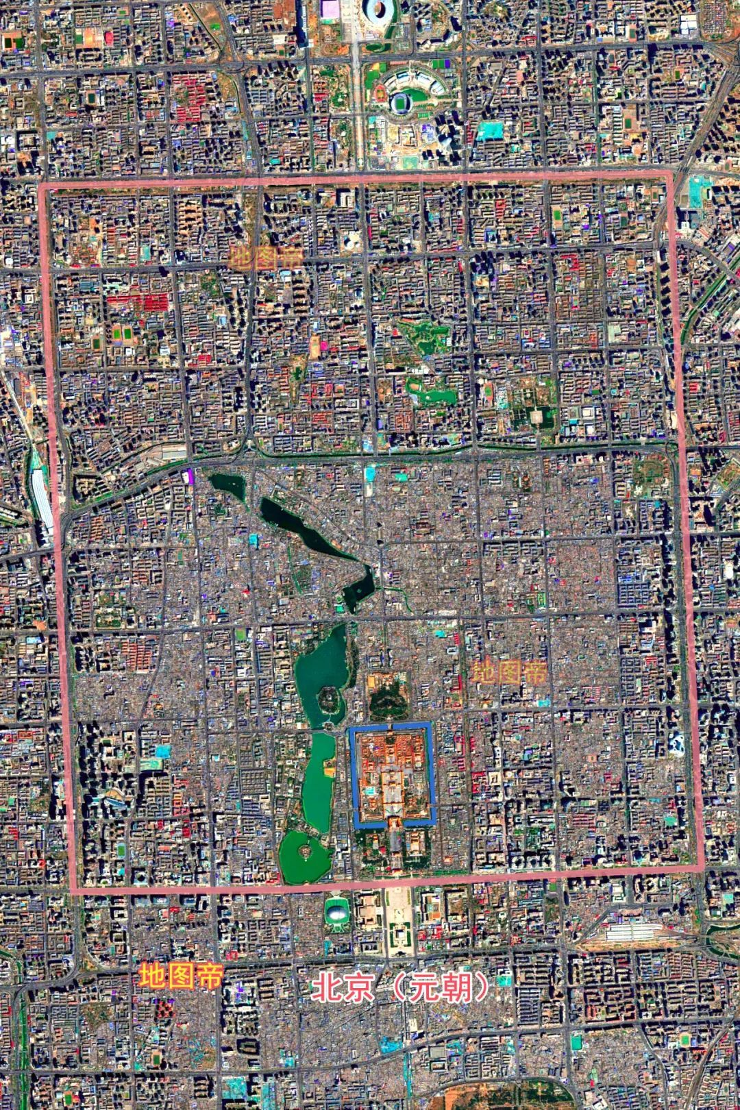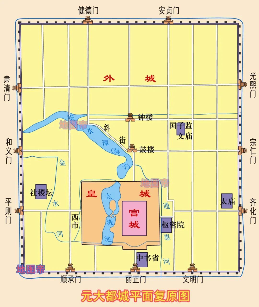 元朝大都城分外城、皇城、宫城,外城呈矩形,东西长约7400米,南北长约6650米,周长约28.6千米(含瓮城)。大都外城辟十一门,南、东、西三面各三门,北面二门,有人戏称为“哪吒三头六臂两足”。