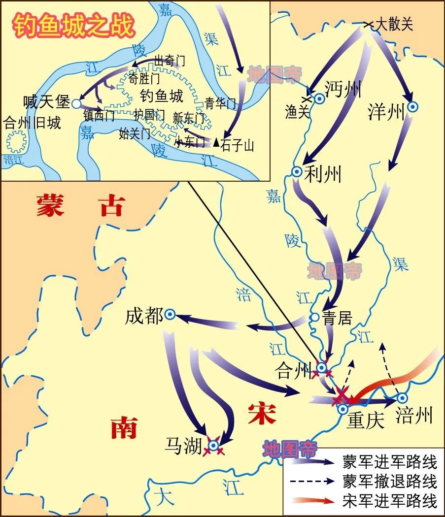 蒙哥之死,导致蒙古帝国内部激烈争夺汗位,蒙哥两个弟弟忽必烈和阿里不哥争汗位,放弃正进攻的鄂州,撤军北上。南宋的西路和中部得到保全,又可以苟延残喘二十年。