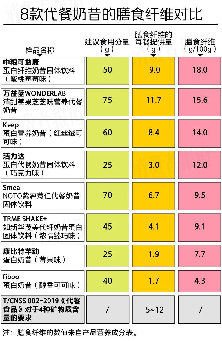 送检结果发现:8款代餐奶昔膳食纤维含量差距最高达4倍多,根据每餐食用分量换算,仅有一半产品的膳食纤维每餐提供量符合标准要求。