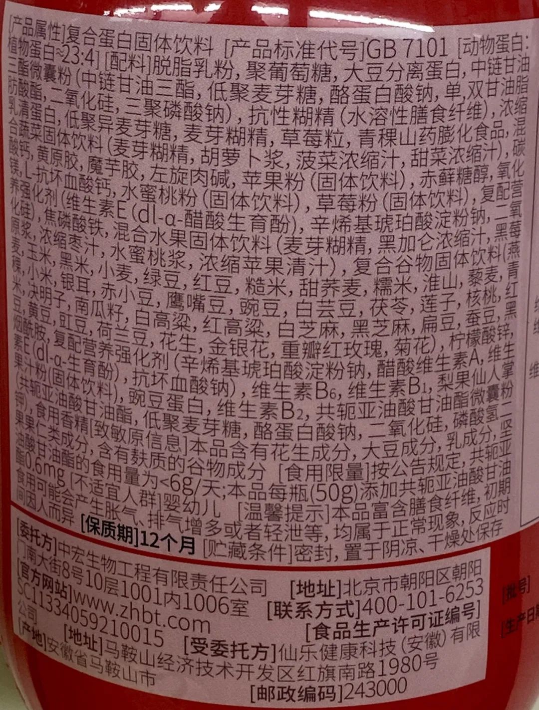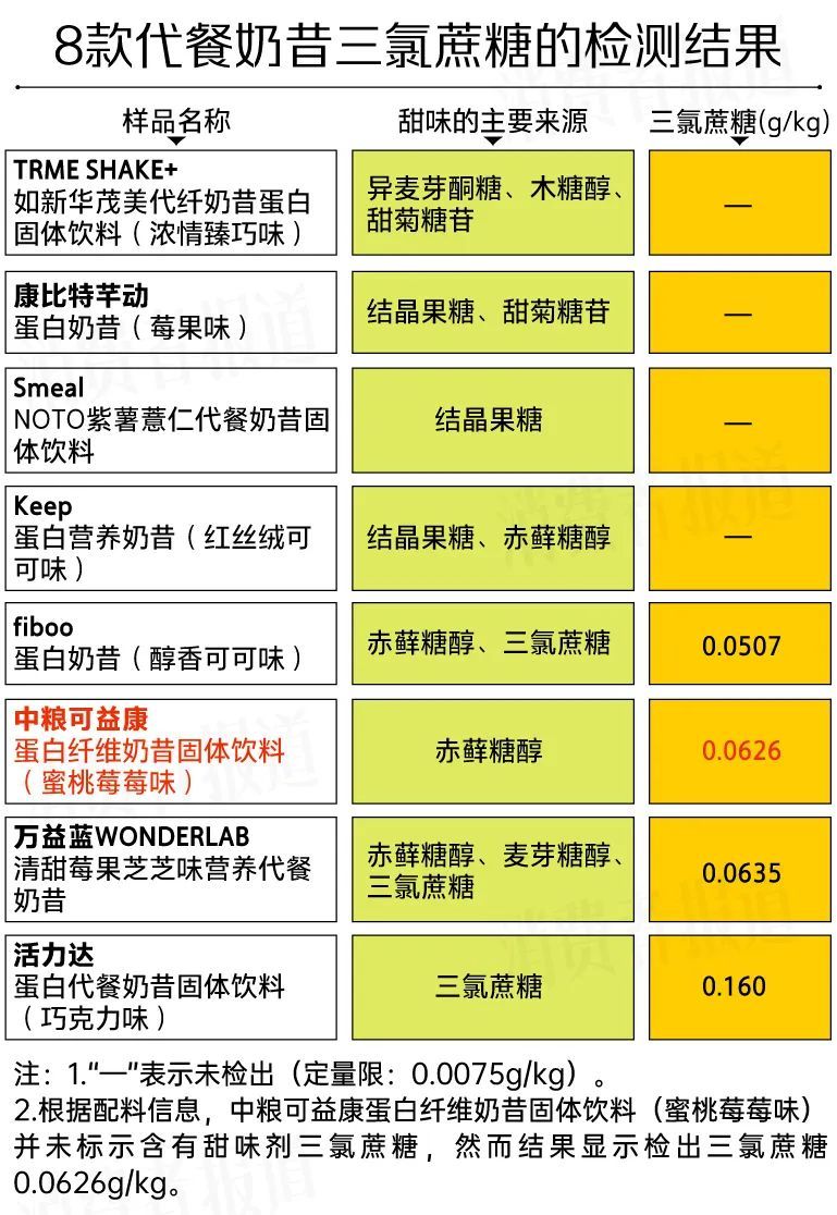 中粮可益康蛋白纤维奶昔固体饮料(蜜桃莓莓味)检出三氯蔗糖,但配料中未标示,不符合相关标准规定。