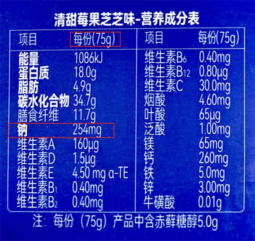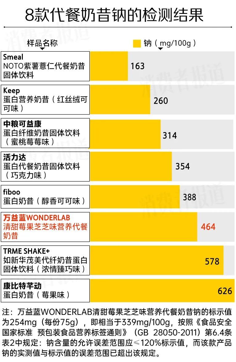 万益蓝WONDERLAB清甜莓果芝芝味营养代餐奶昔钠的标示值为254mg(每份75g),即相当于339mg/100g,按照《食品安全国家标准 预包装食品营养标签通则》(GB 28050-2011)第6.4条表2中规定:钠含量的允许误差范围应≤120%标示值,而该款产品钠的实测值与标示值的误差范围已超出该规定。