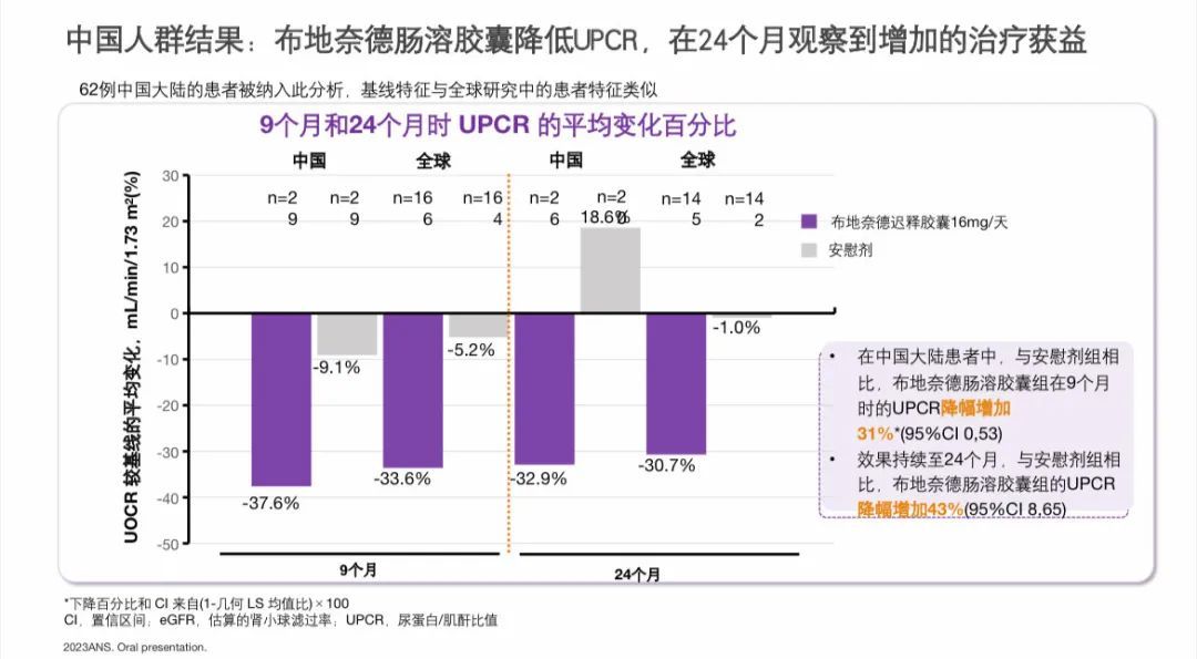 蛋白尿方面,与安慰剂相比,9个月的耐赋康®NEFECON®(布地奈德肠溶胶囊)16 mg/d治疗分别在9个月和24个月时使UPCR(尿蛋白肌酐比)平均降低31%和43%。