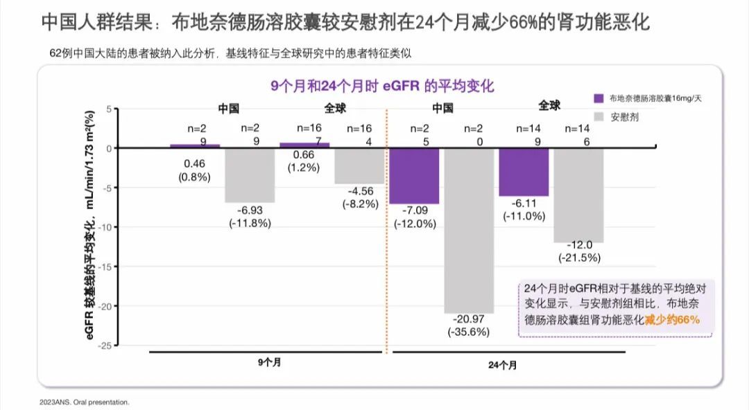 NefIgArd研究中国亚组分析表明,在2年的治疗和观察期间,在24个月时,16mg/天的耐赋康®NEFECON®(布地奈德肠溶胶囊)组eGFR下降了7.09 mL/min/1.73 m²,而安慰剂组的eGFR下降了20.97 mL/min/1.73 m²(如下图)。这表明,在2年期间(9个月治疗期和停止试验用药观察15个月),耐赋康®NEFECON®(布地奈德肠溶胶囊)治疗的患者肾功能恶化程度较安慰剂减少了约66%。