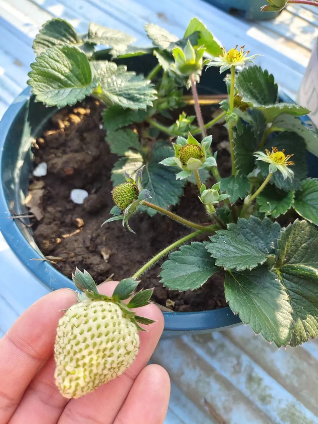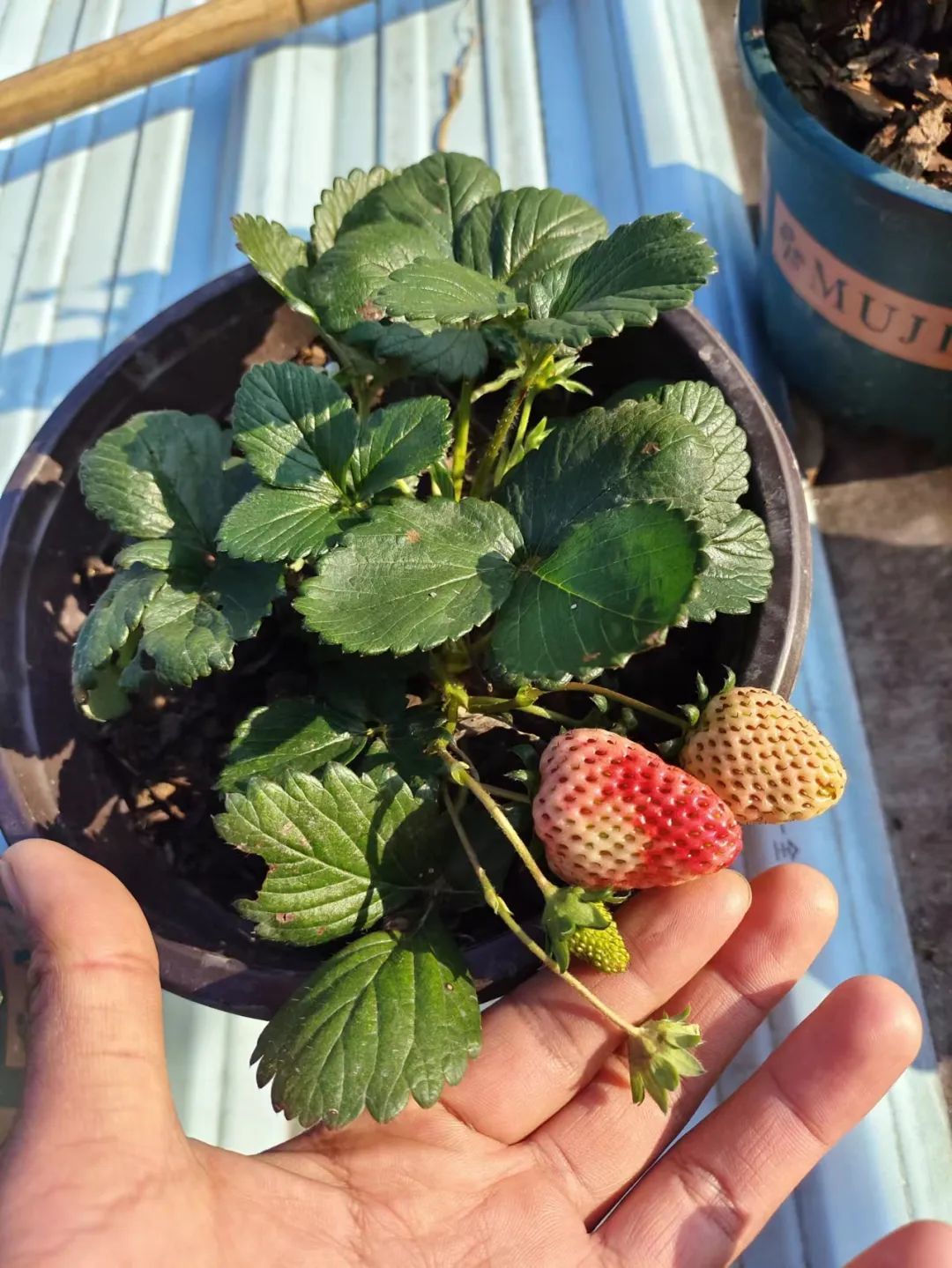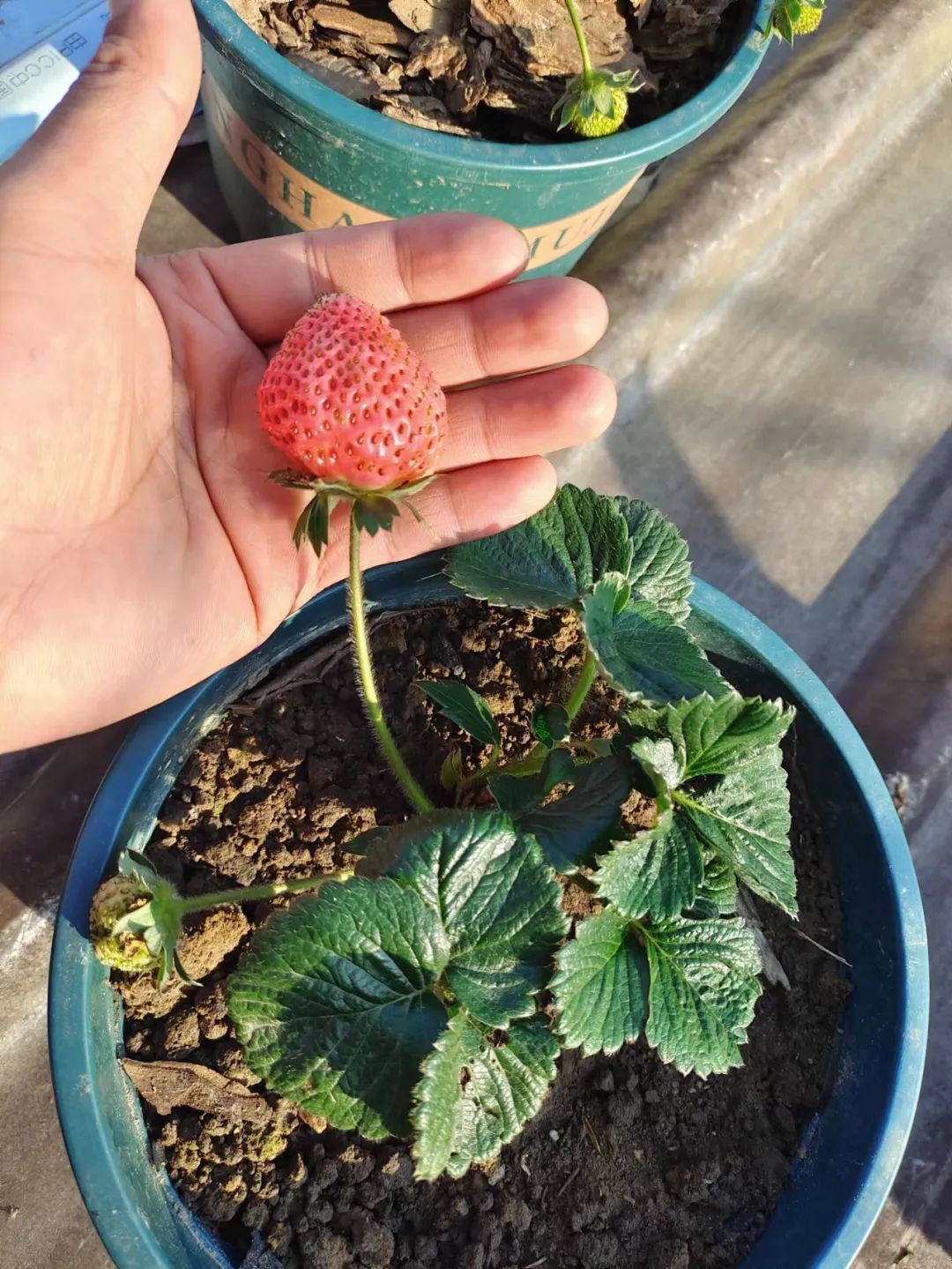 大概四五天过后,草莓苗的叶子挺起来了,状态比较好了,就可以在盆土比较干的时候带土换盆。