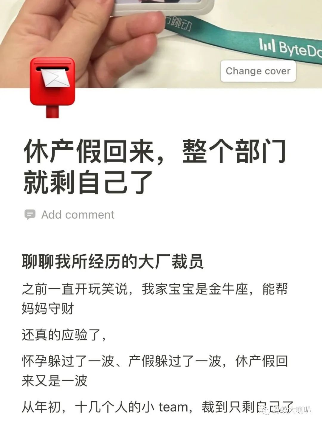 一位字节网友发文叙述自己所经历的大厂裁员。怀孕躲过了一波,产假躲过了一波,休产假回来又是一波。从年初十几个人团队的小Team,到现在只剩下自己一个人了。