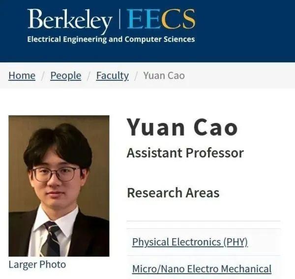 加州大学伯克利分校(UCB)官网显示,曹原将于2024年7月起正式担任该校电子工程与计算机科学系助理教授。研究领域:Physical Electronics(物理电子学)、Micro/Nano Electro Mechanical Systems(微纳机电系统)、Physics(物理)。