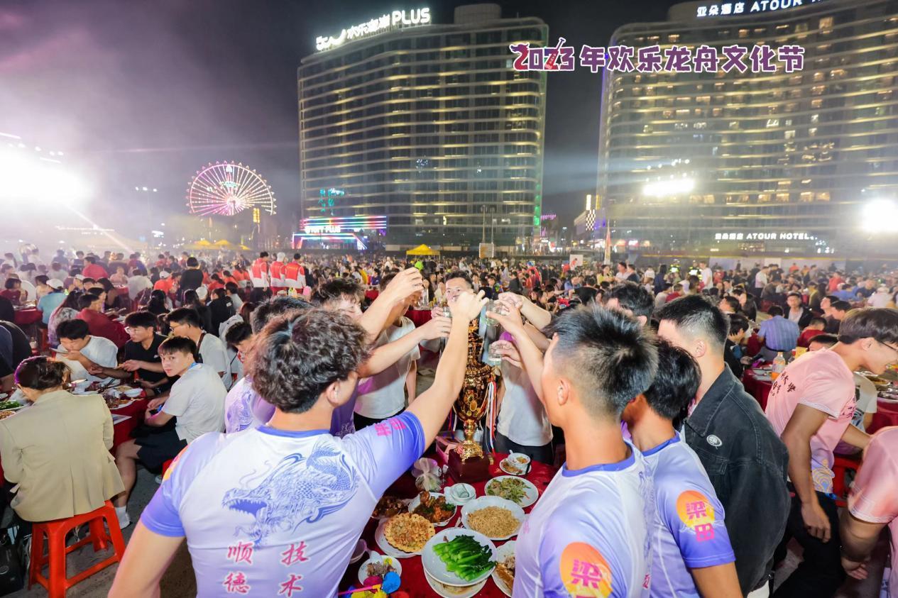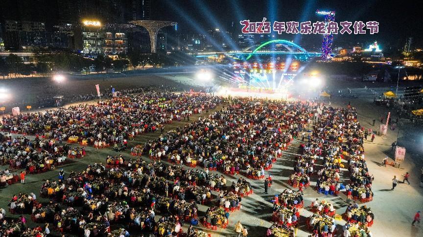 值得一提的是,顺德龙舟宴把龙眼点睛、切烧猪、龙舟习俗展演、龙舟说唱非遗项目融汇其中,展现顺德龙舟民俗文化。此外,2023年中国龙舟大奖赛颁奖仪式也在“万人龙舟宴”现场举行,庆贺龙舟队员夺锦而归。