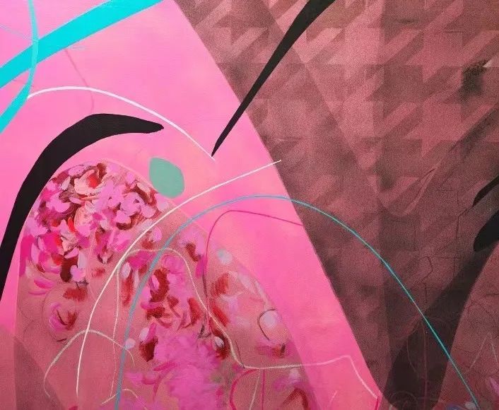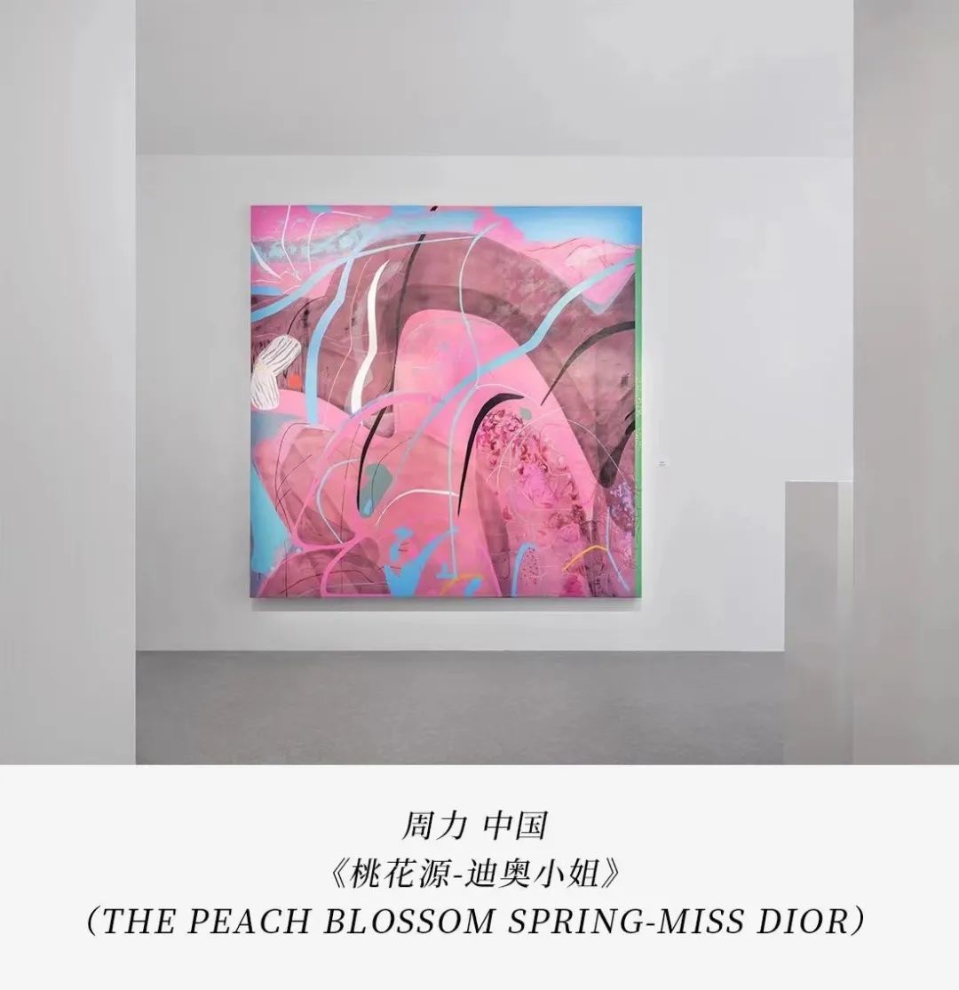 《桃花源-迪奥小姐》延续了艺术家周力一贯的独特风格,运用抽象色彩和灵动线条,试图再现对自然和内心感知的表达。作品的基本色调以粉色为主,与人的感觉紧密相连。最初的灵感来源于艺术家在怀孕期间对新生命的期待,透明的粉红犹如婴儿的柔嫩肌肤。然而,这份期待受到了亲人离世的影响,这一时期伴随着对痛苦的抚慰和对生命历程的深刻思考。因此,对她而言,粉色既是生命的象征,也是能够缓解痛苦并带来希望的色彩之一。