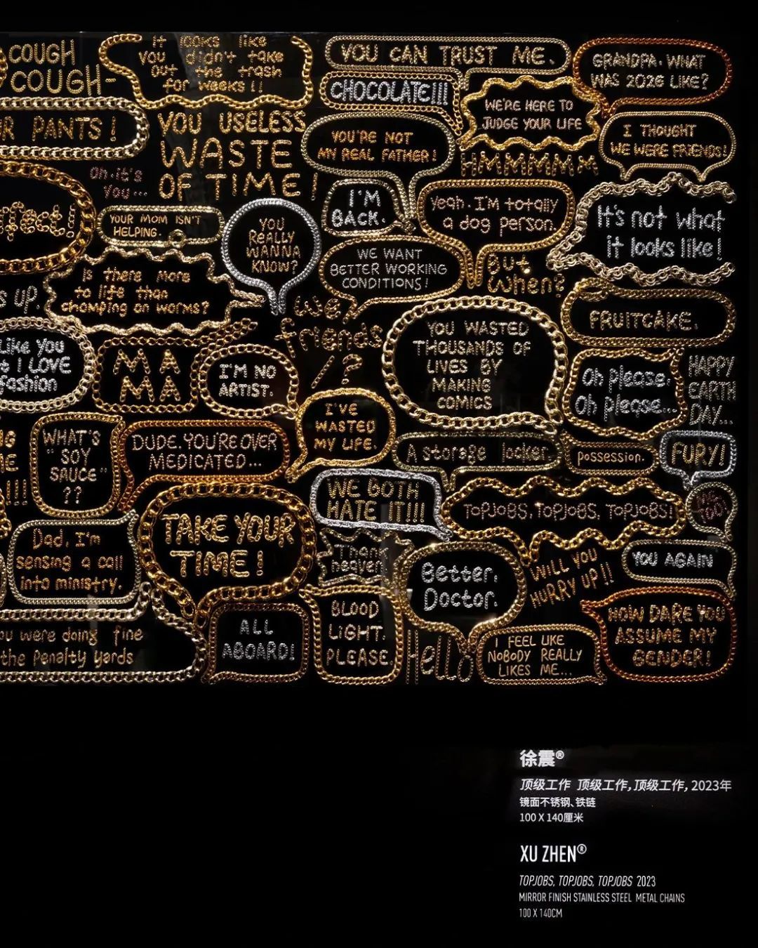 ▲徐震,《顶级工作,顶级工作,顶级工作》,2023年镜面不锈钢、铁链,100 x 140 厘米