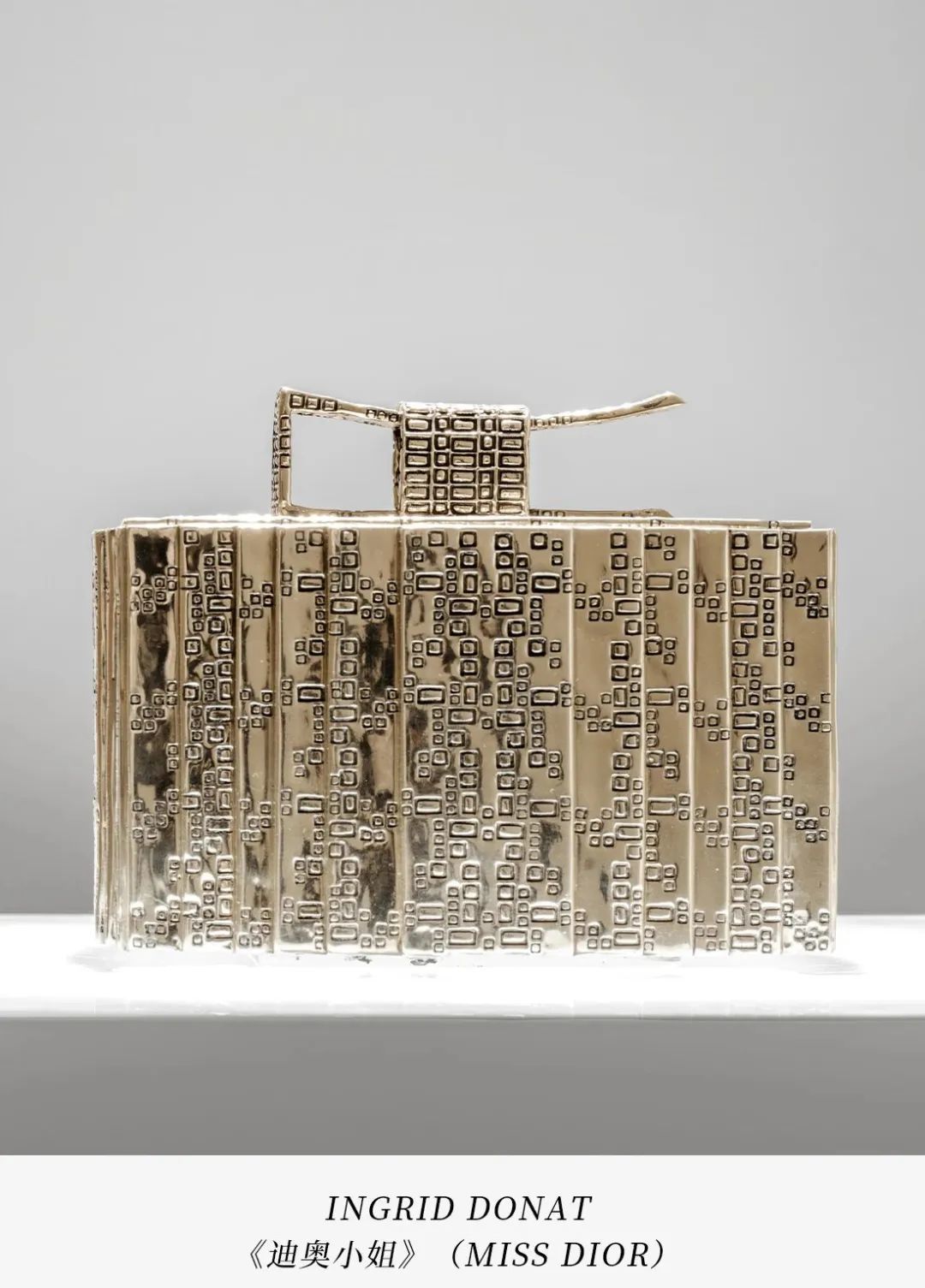 INGRID DONAT巧妙地将Miss Dior迪奥小姐香水转化为一件珠宝艺术品。粉色的喷砂玻璃香水瓶被包裹在一层银色青铜外壳中,表面雕刻的图案酷似经典的千乌格纹。这件作品是向卡特琳娜·迪奥(Catherine Dior)致敬的,她代表着每一位女性所共有的坚强与温柔。