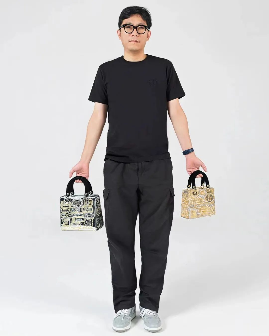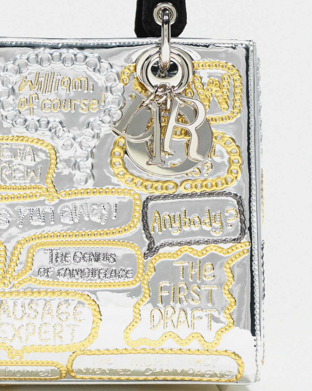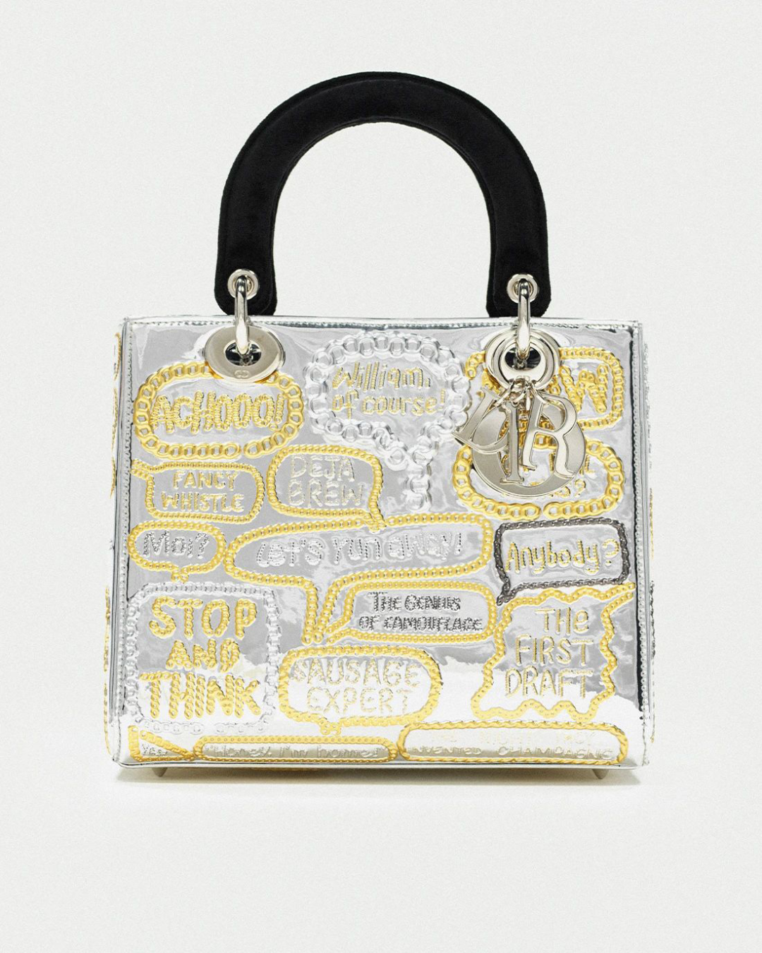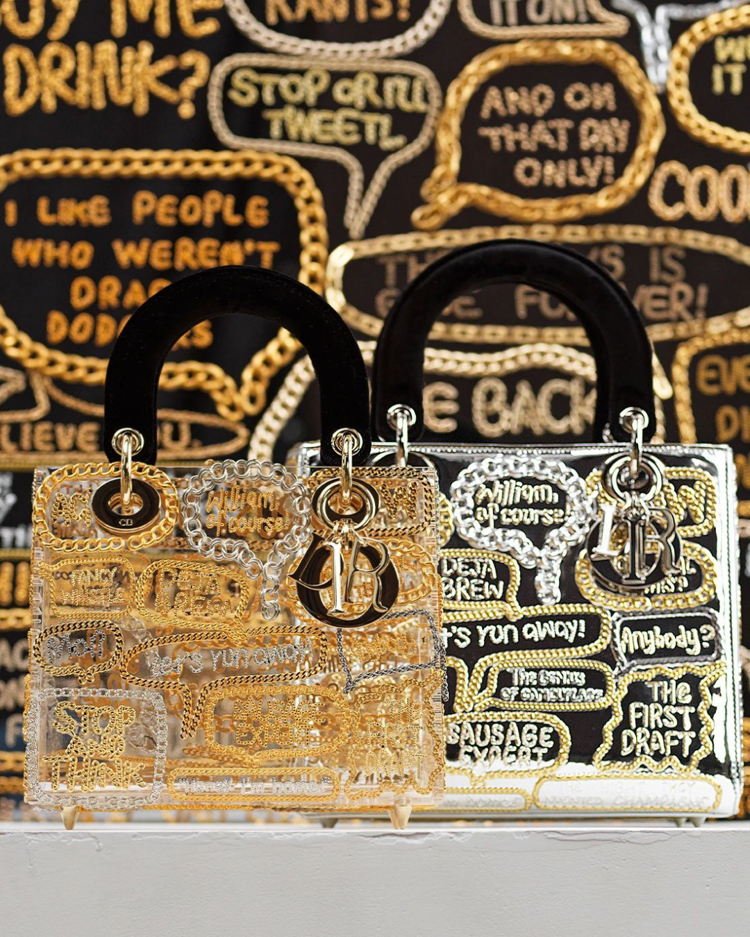 徐震打造的两款全新 LADY DIOR 手袋灵感源自其个人系列作品《金属的语言》,它们采用透明有机玻璃和镜面印花材料制作而成反光的手袋表面则饰以金色和银色的短语和感叹句,并依次由金属链条勾勒出来。