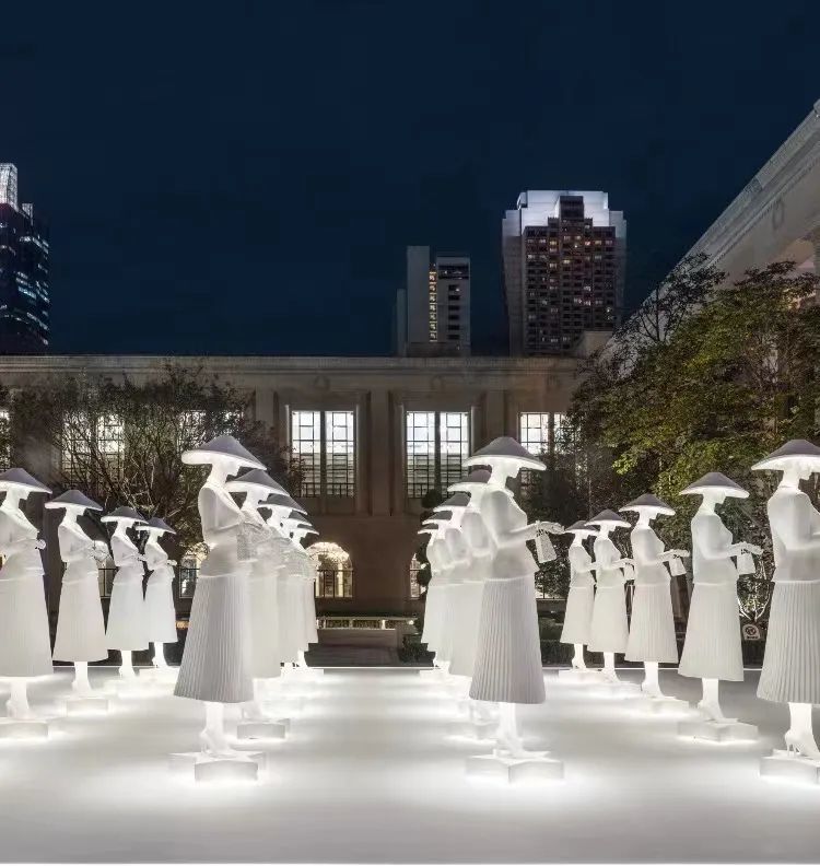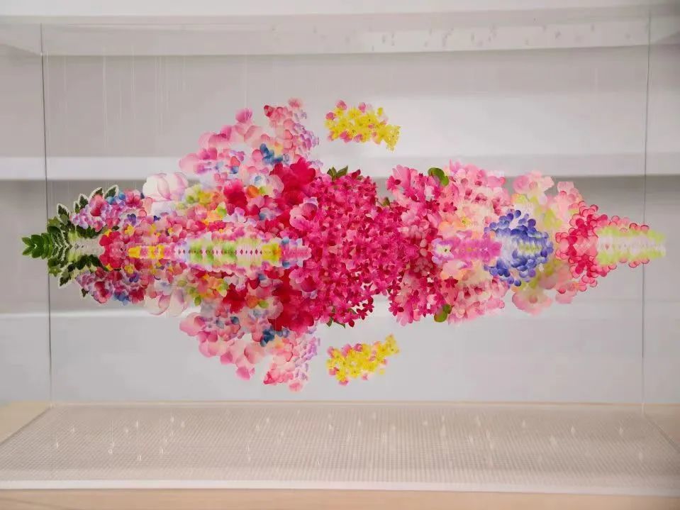 在这件作品中,展现了日本艺术家HARUKA KOJIN对人类与自然、以及人造世界之间和谐关系的深刻思考。她以一种独特的方式将Miss Dior迪奥小姐香水进行解构,将其转化为一大片悬挂在透明空间的布制花瓣,仿佛是一群翱翔的飞鸟,与香水瓶身上的格纹相呼应,而这种格纹在日语中被称为“千鸟”。