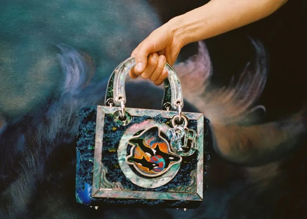 她共创作了三件作品,包括两款中号手袋和一款小号手袋,在超现代的视角下,展现了传统的螺钿细工镶嵌技艺“NAJEONCHILGI”的崭新生命。每一件作品都充满了精巧细致的复杂细节,珍珠母贝的镶边仿佛为探索艺术家的奇幻世界打开了一扇窗户。