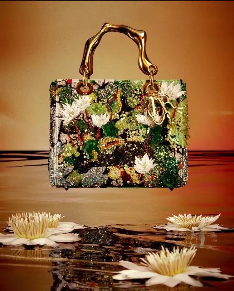 迪奥工坊通过卓越的工艺将这一设计灵感变为现实,运用串珠、宝石和亮片等材质,进一步提升了这一独特作品的细节魅力,创造出又一个生动的杰作。刺绣制成的睡莲花朵在奇妙的花园中闪烁着光芒,层层叠叠的技法仿佛唤起了多重层次的绘画意象。经典的"DlOR"字母吊饰和手柄经过重新演绎,呈现出精致的波浪造型,为这款与众不同的手袋增色不少。这是对植物世界之美的一首赞歌,也是对克里斯汀·迪奥先生所热爱的壮丽自然的致敬。