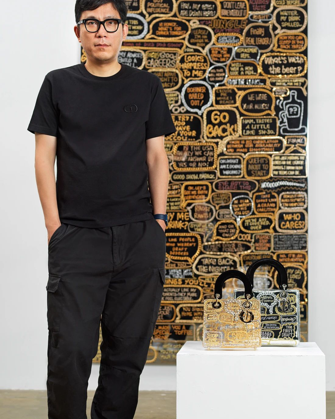 徐震,出生于上海,他将装置、影像、绘画和行为艺术融合在他独特的艺术实践中,从而奠定了其作为中国当代艺术领域标志性人物的地位。徐震引人入胜的作品融合社会学和历史学,既发人深省又不失幽默感,不仅颠覆(相对于大规模生产的)手工艺和原创性的定义,同时也向数字时代的所有权和全球化的概念发起挑战。在此次与迪奥的合作中,他试图反思言论的价值和意义,以一种近乎讽刺的方式挪用了某些既定的表述方式。