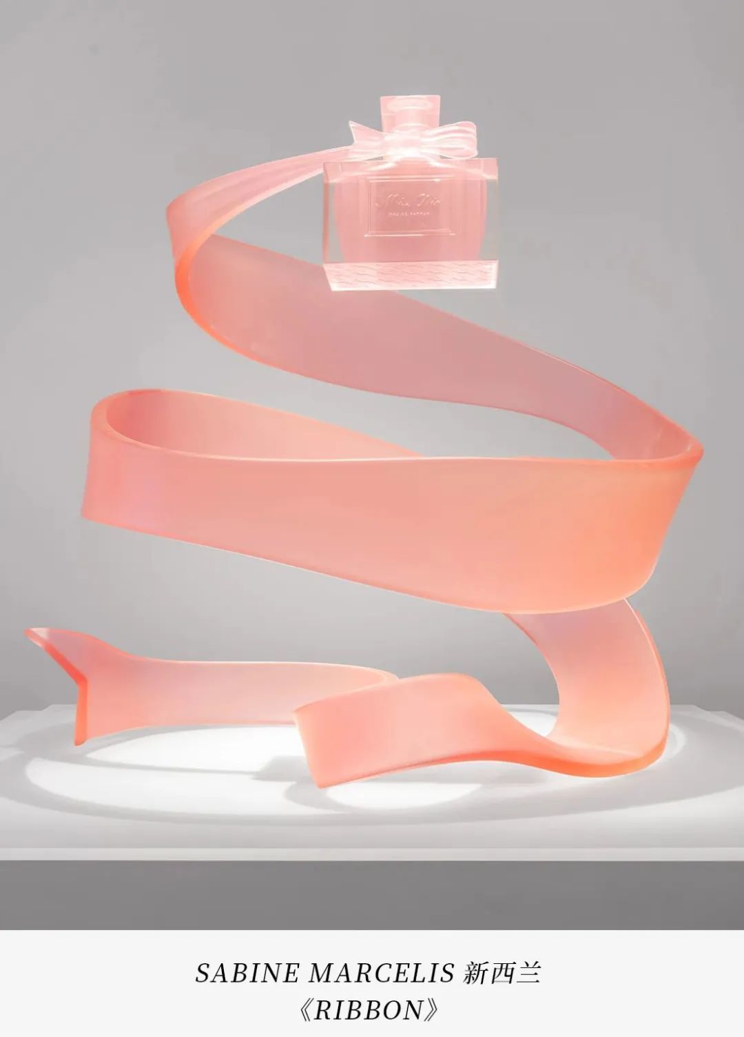 SABINE MARCELIS选择运用她钟爱的材料与色调,打造了一件粉色树脂雕塑。主体结构的顶端正中悬挂着一只香水瓶,仿佛轻盈地飘浮在半空中。通过丝带这一设计概念,表达了Miss Dior迪奥小姐香水的自由与轻灵感,展现了其迷人的精髓。