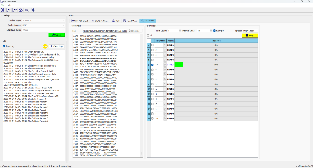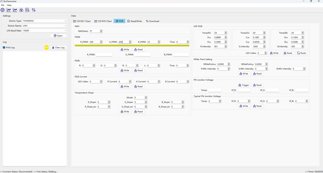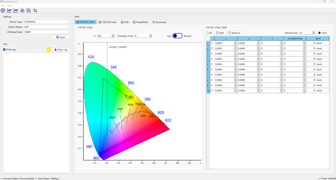 为了更为便捷的开发调试,泰矽微开发了功能强大的PC端上位机软件。该上位机软件支持CIE 1931色品图和CIE 1976色品图点亮,以及完整的产线校准命令和LIN升级固件的功能。提供完整的3C和3D命令供第三方产线校准工具集成,目前已有多家产线校准和量产烧录工具实现对TCPL01x的支持。