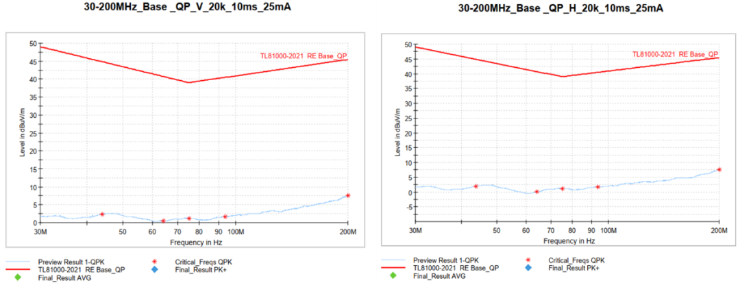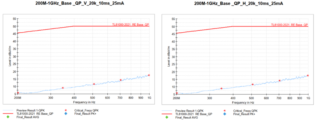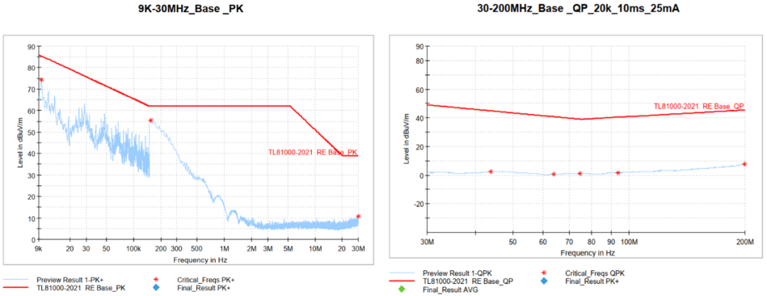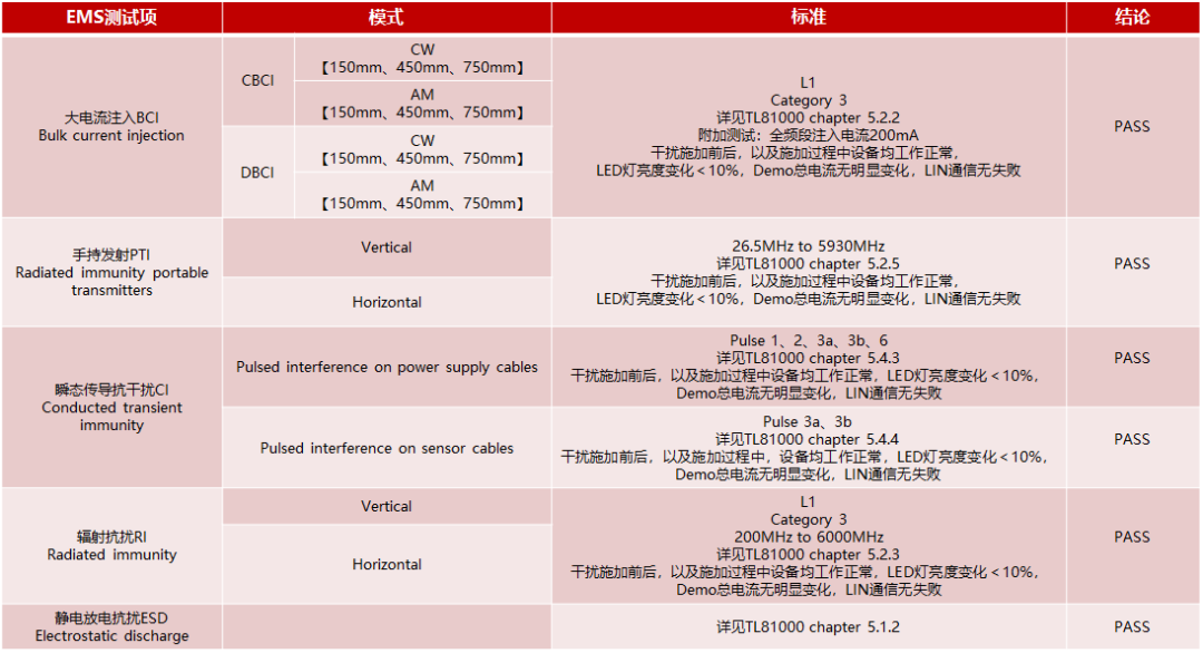 泰矽微TCPL01x氛围灯方案在BCI测试项上,基于大众汽车VOLKSWAGEN TL81000:2021-06 《Electromagnetic Compatibility of Electronic Components for Motor Vehicles》测试标准的同时,将全频段BCI注入电流提升到上限200mA进行测试,测试结果依旧以最高等级要求通过测试。