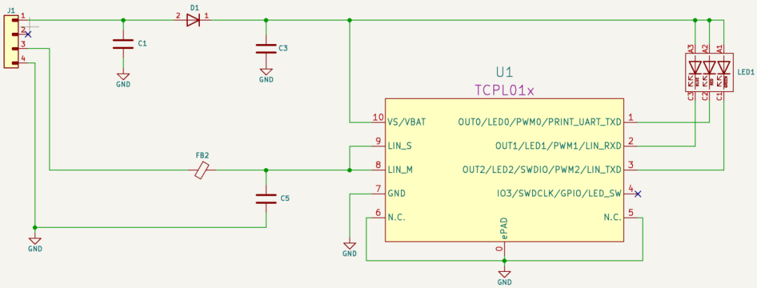 得益于泰矽微TCPL01x芯片优异的ESD/EMC性能,基于HBM模型,芯片电源管脚可直接承受4KV、LIN通信端口可直接承受8KV以上的抗静电能力。在成本优先考虑的情况下,硬件设计上,电源端口可以省去TVS管、LIN通信端口可以省去ESD防护二极管,可有效实现降本。整体外围电路器件数量低至5颗,全面超越所有同类产品。在面积和成本都极度受限的氛围灯灯头应用中,泰矽微的解决方案无疑具有绝佳的优势,树立了行业的天花板。