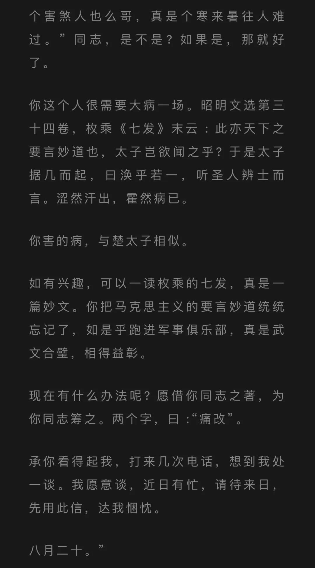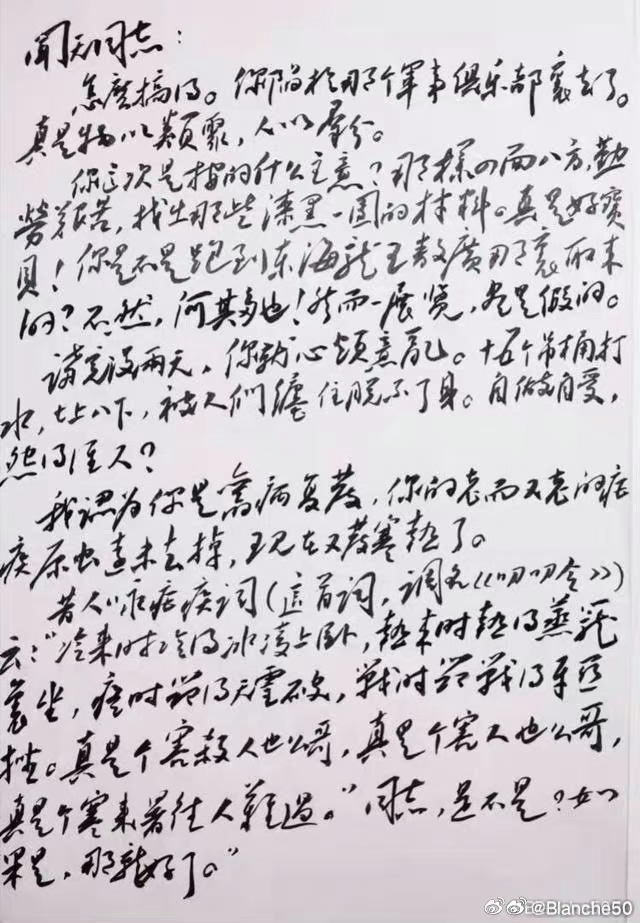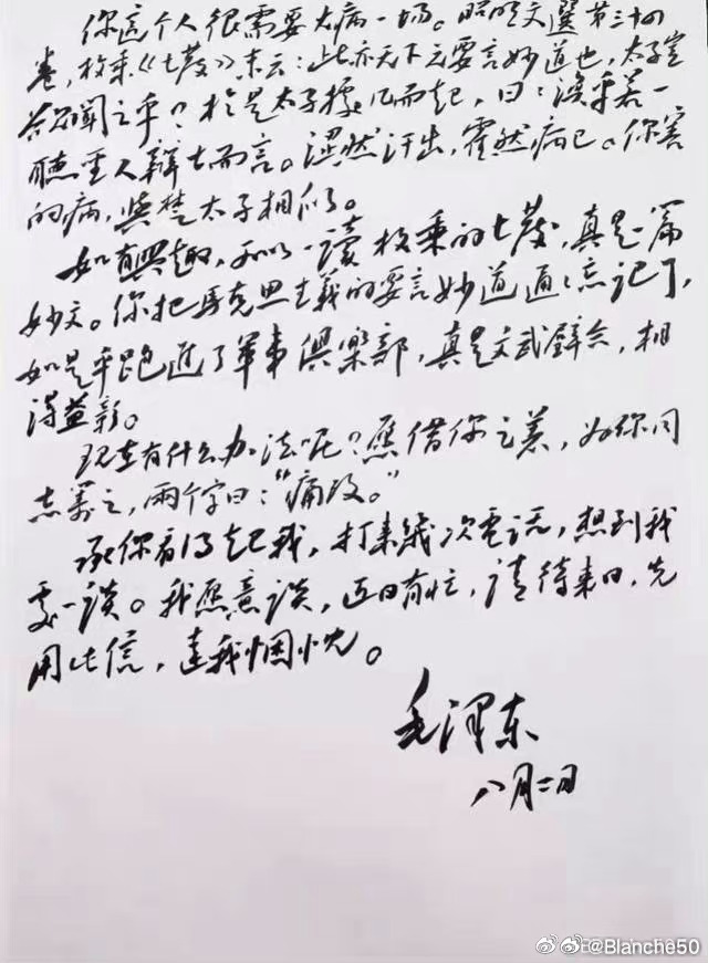 这封书信,内容上避开政治不谈,的确是一篇好文章。只有真性情、有原则、有知识的人才能写得出来。性情直率,语言幽默,多处用典,令人诚服。就书法而言,也是伟人巅峰时期的作品,虽无大草之势,亦有行草之畅。