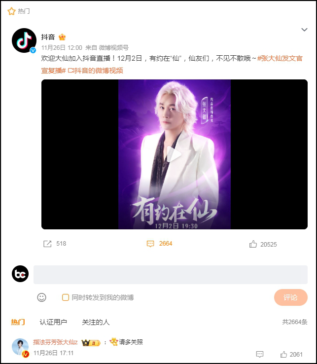 11月26日,停播100多天后,张大仙在自己的抖音账号发布了一则视频,官宣将在抖音开启直播,首秀时间是12月2日。随后,抖音官方也回应道:欢迎大仙加入抖音直播!