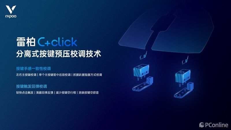 看完外在,我们看看内在。拆开鼠标后,这款鼠标沿用了雷柏自研的C+click分离式按键预压校调技术。